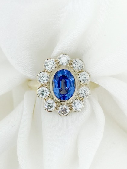 A104 Bague entourage saphir bleu et diamants sur or jaune